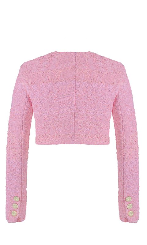 Fabric Material Description: 94% Cotton, 06% Elastane Elegant form-fitted full-length dress. It features a slit at the back, reaching the knee, adding a sophisticated touch…Jacket «Pink Aura»