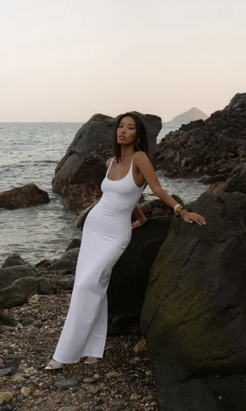 Fabric Material Description: 47% Cotton, 47% Lycra, 06% Elastane This is an exquisite floor-length dress with a high neckline and long sleeves. it gracefully contours…Jersey Dress Floor Length Silhouette White