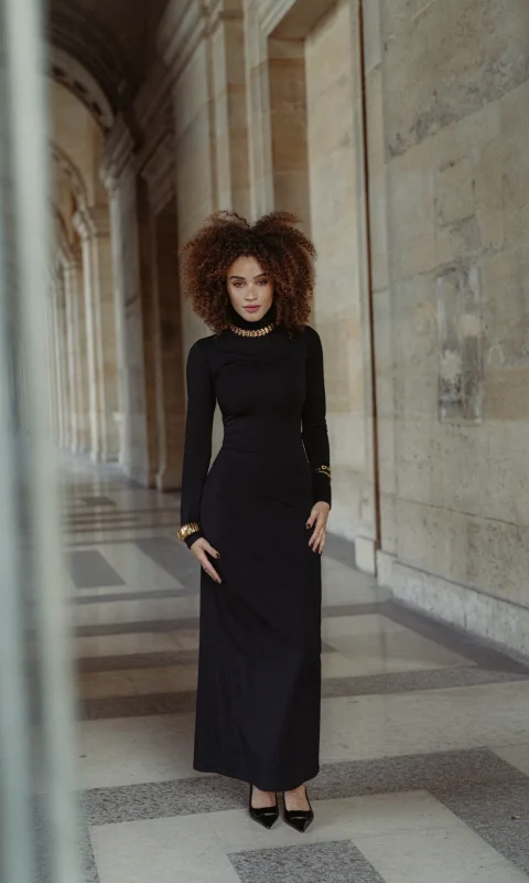 Fabric Material Description: 47% Cotton, 47% Lycra, 06% Elastane Sophisticated full-length form-fitting dress with long sleeves, crafted for those seeking to accentuate their uniqueness. Featuring…Dress Sensual Jersey