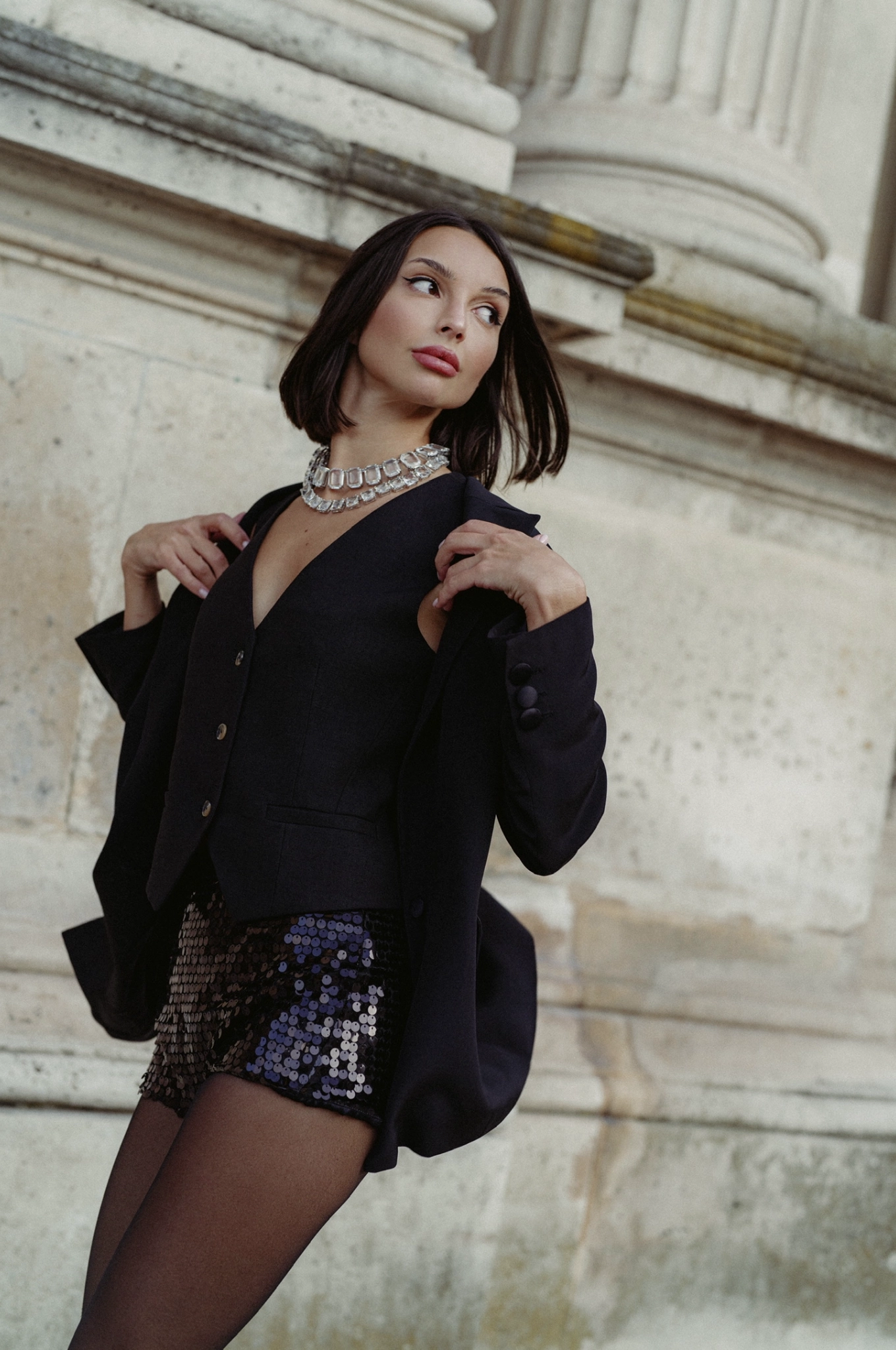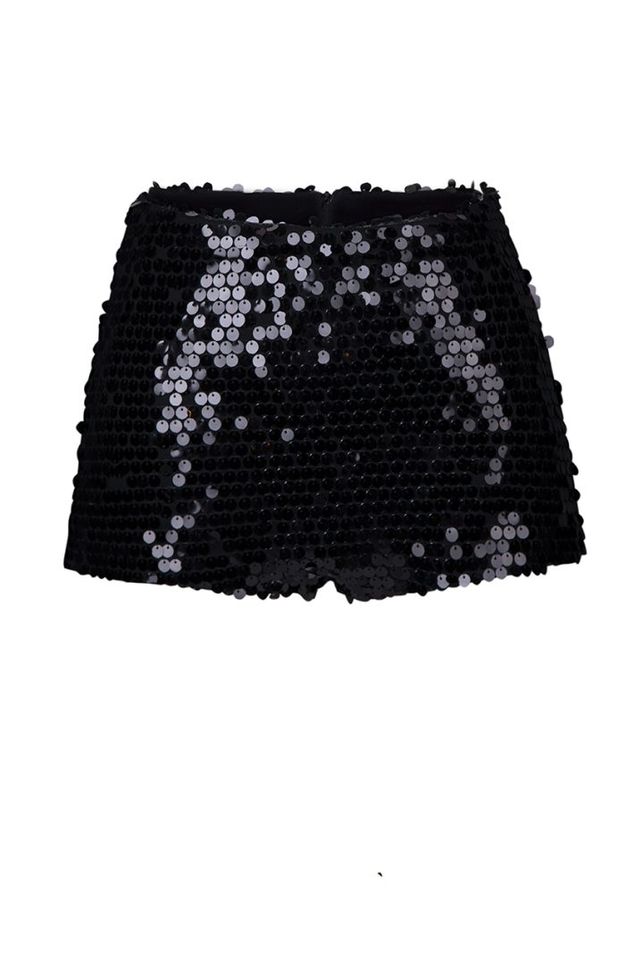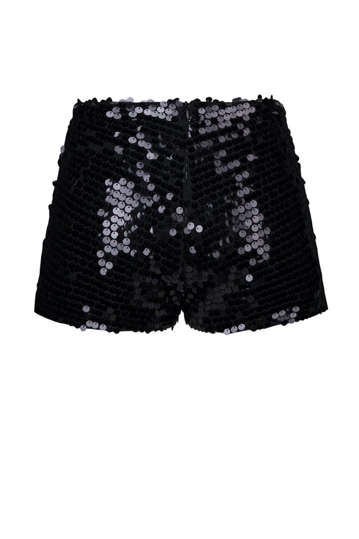 These black women’s shorts are crafted from a fabric studded with sequins and has silk lining, giving it a special touch of luxury and shimmer. The short length and high Waist make them the epitome of classic elegance. They fasten at the back with a concealed zipper, which gives them comfortable fit.