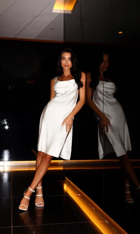 Fabric description: 100% Silk This white silk dress with a unique design is a true work of art. Its length falls below the knee and…In stock