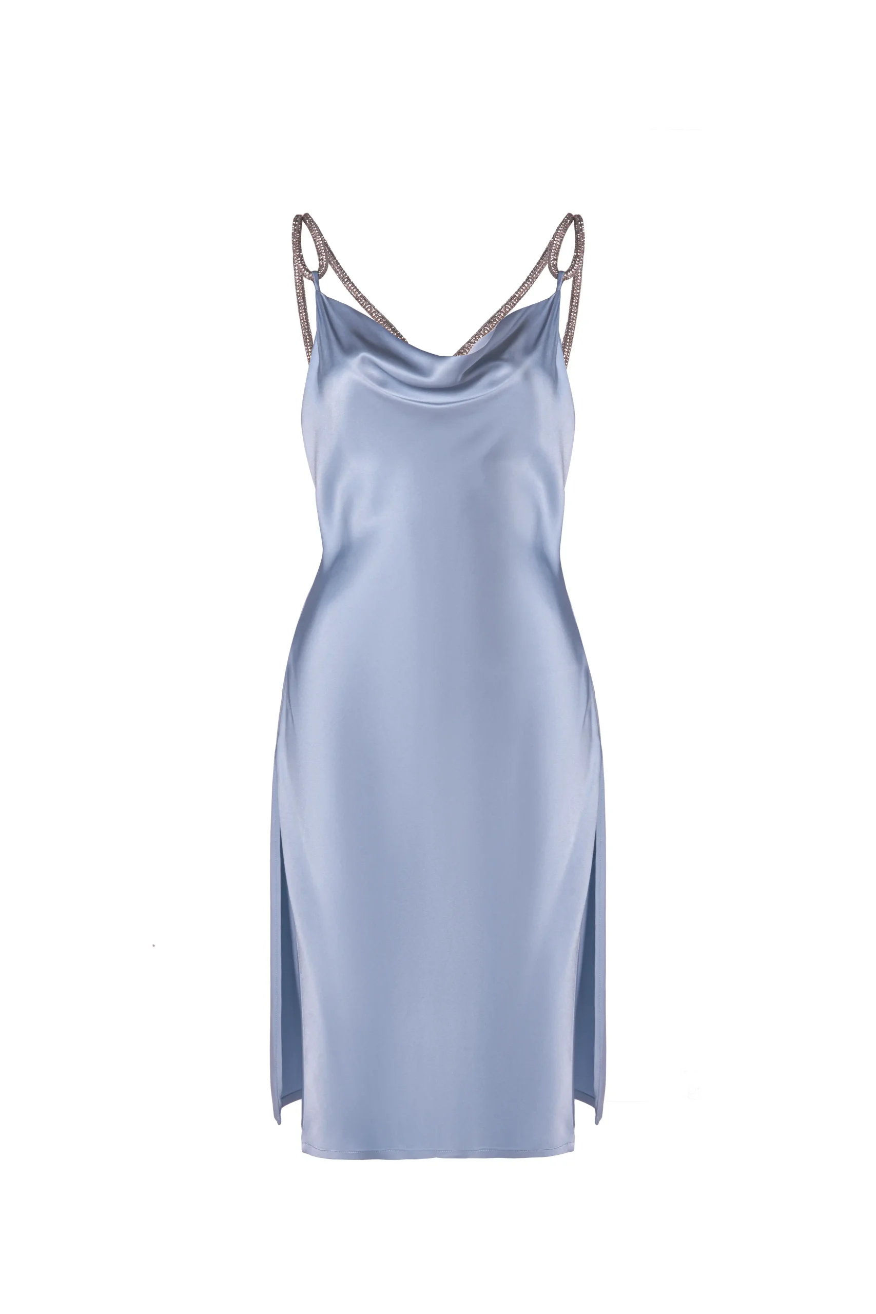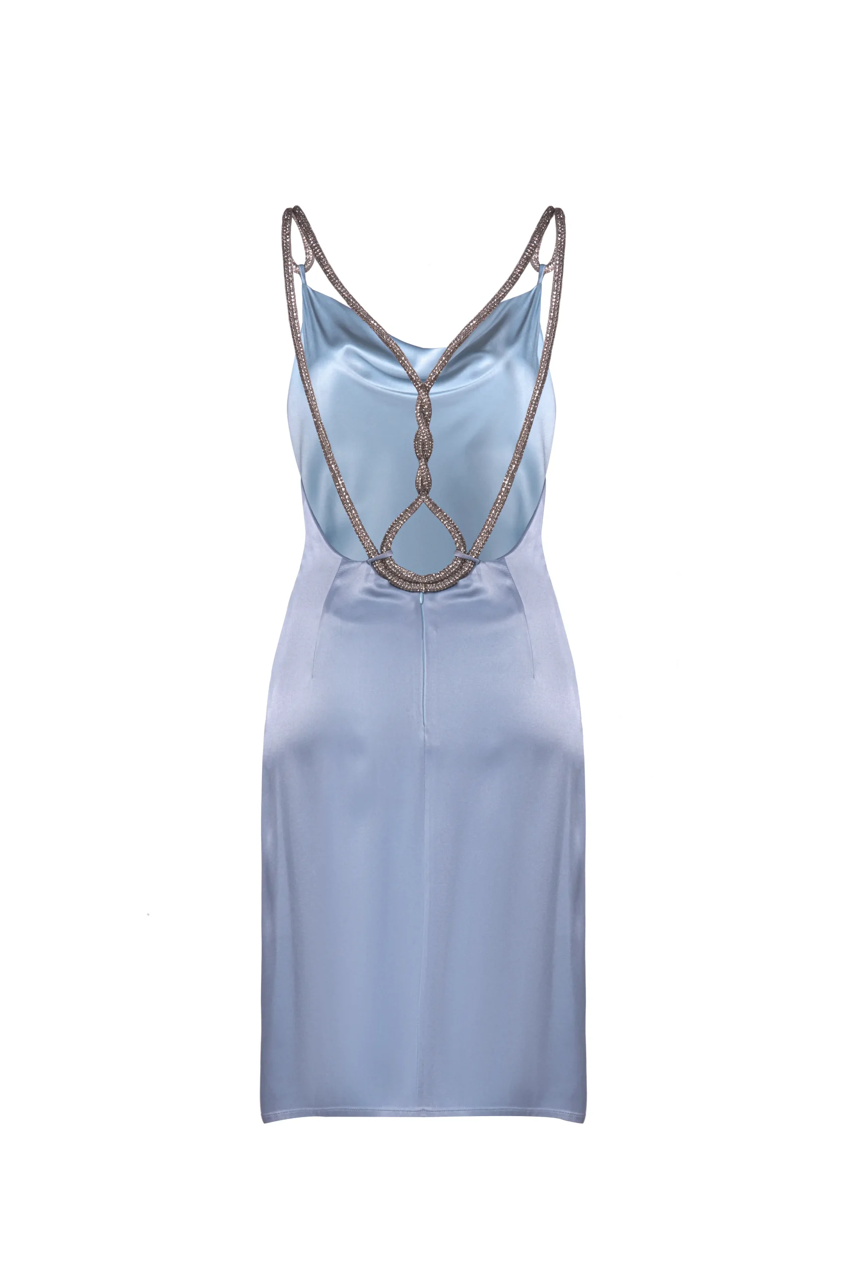 This blue silk dress with a unique design is a true work of art. Its length falls below the knee and features side slits that create elegant lines down to the hips. The deep back neckline, plunging to the waist, adds sophistication, crystal cord, adding a touch of sparkle. A zipper at the back ensures easy wearing and comfort.