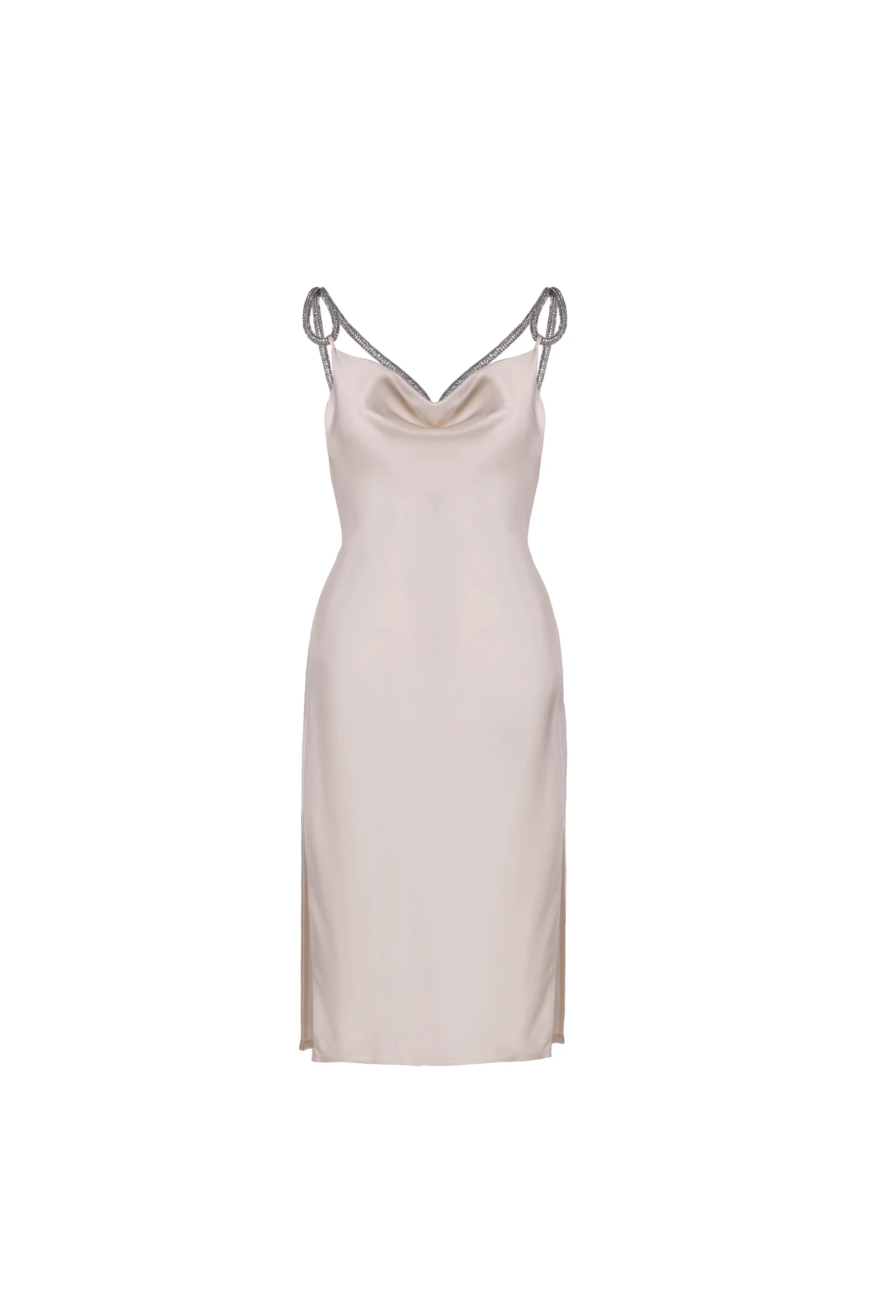 This white silk dress with a unique design is a true work of art. Its length falls below the knee and features side slits that create elegant lines down to the hips. The deep back neckline,