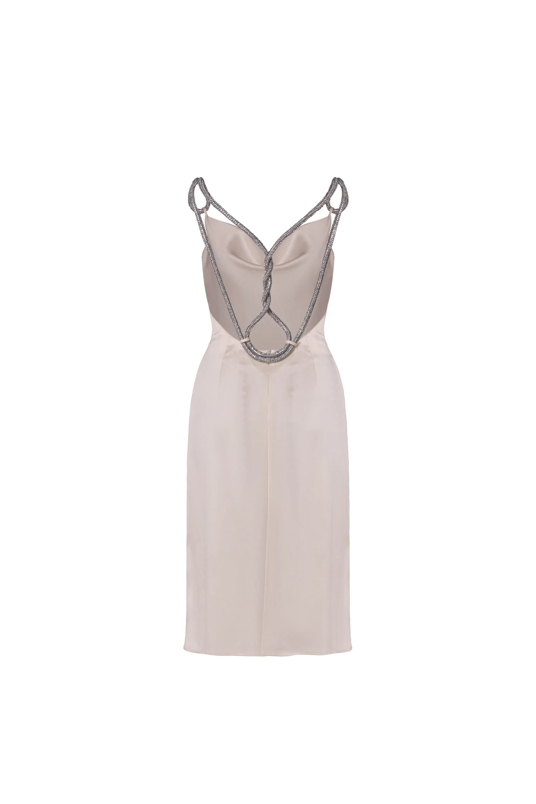 plunging to the waist, adds sophistication, while a crystal cord replaces traditional straps, adding a touch of sparkle. A side zipper ensures ease of wear and comfort.