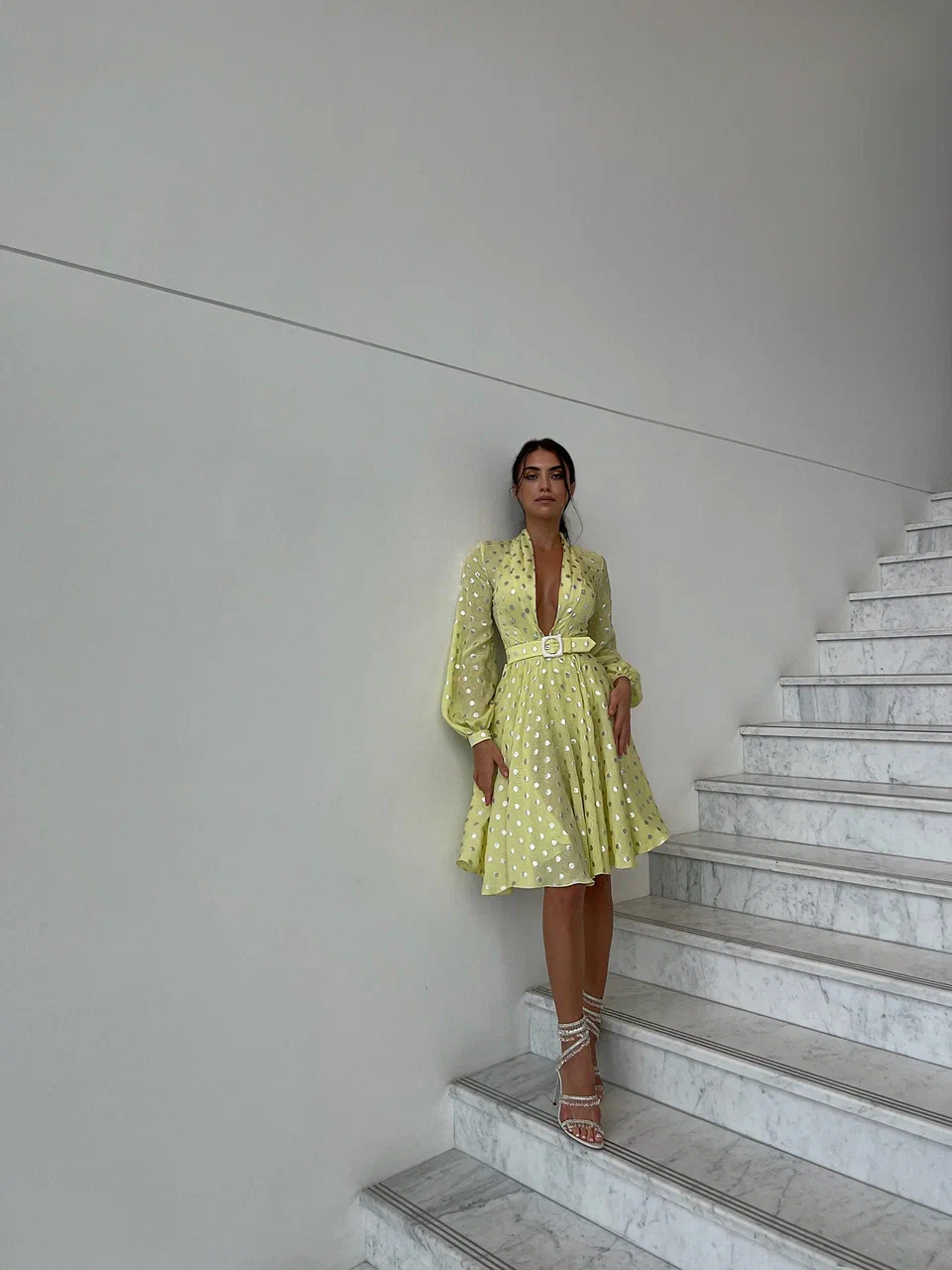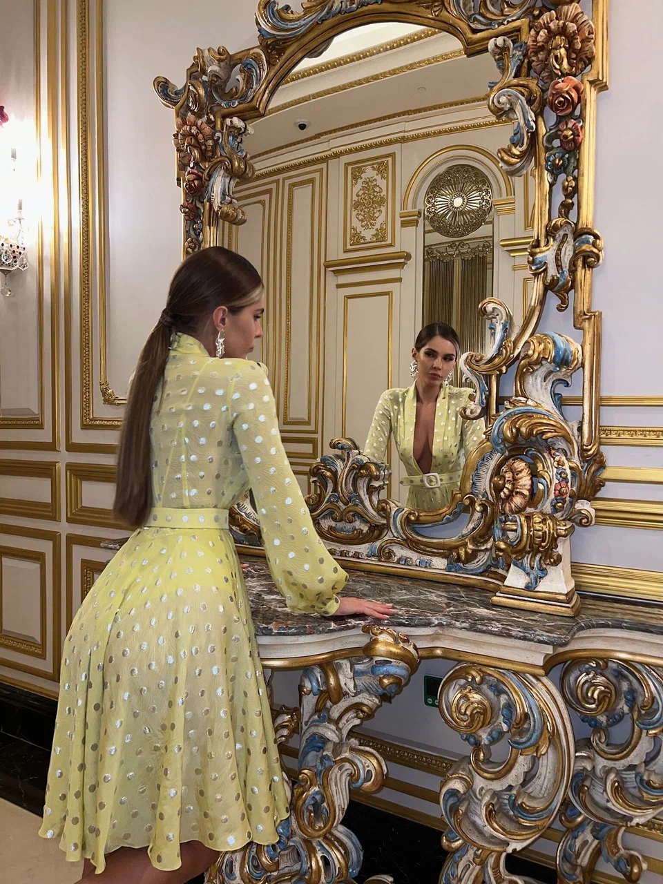 Fabric description: 100% Silk This white silk dress with a unique design is a true work of art. Its length falls below the knee and…