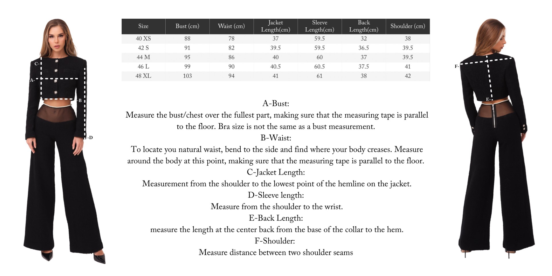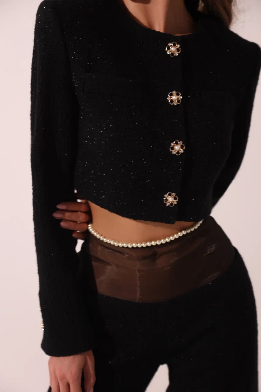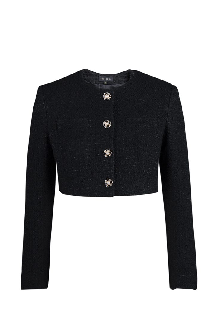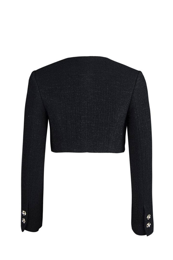 The black women’s short jacket is crafted from tweed, lined with silk, and fastened with four buttons. Luxurious details, including two buttons on each sleeve, make this jacket an embodiment of outstanding style and unsurpassed quality.