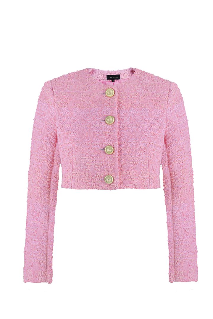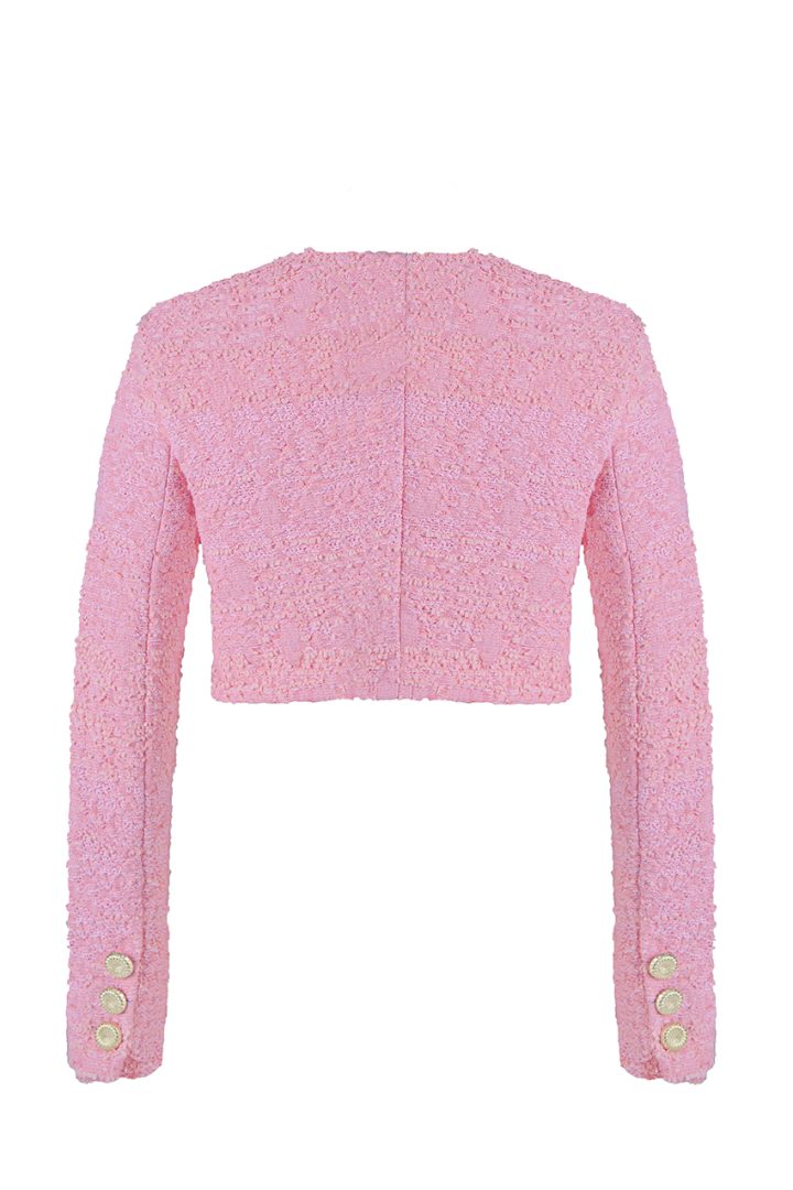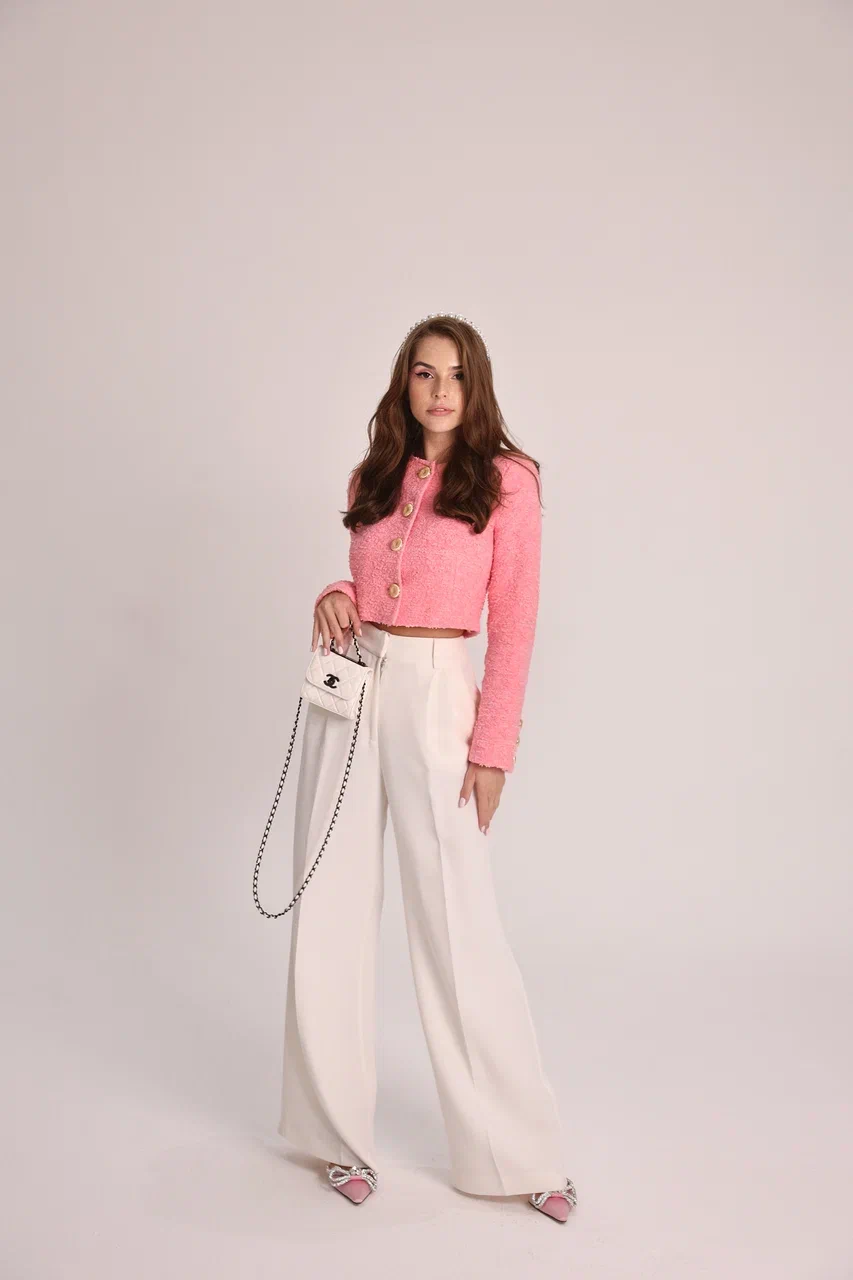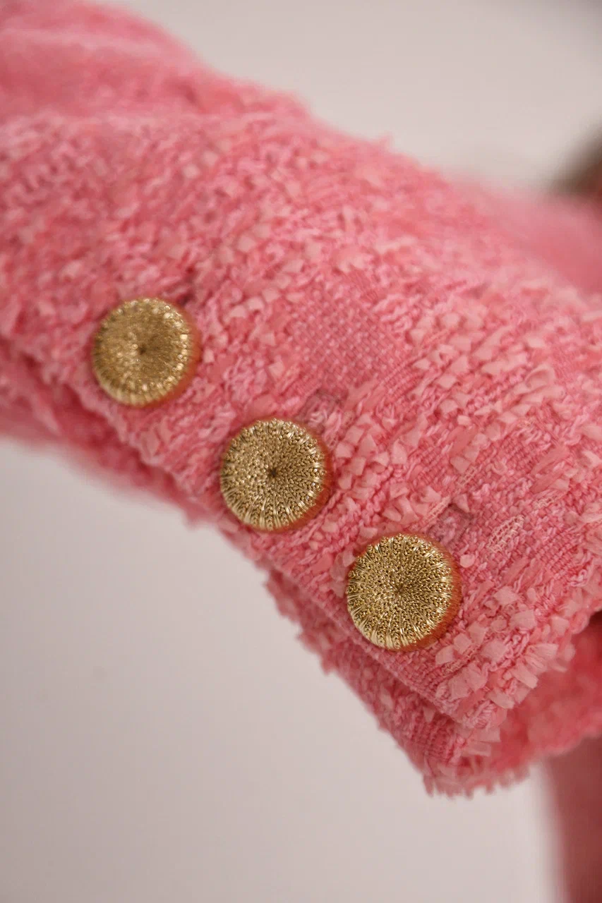 A women’s jacket of standard length, crafted from a unique custom-made pink tweed. It features a pink silk lining, fastens with four golden buttons, and luxurious details with three buttons on each sleeve, making this jacket an unrivaled embodiment of style and quality.