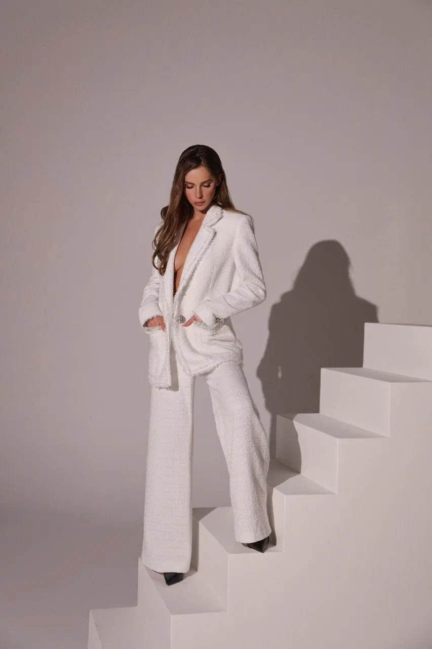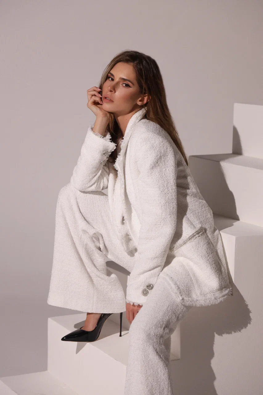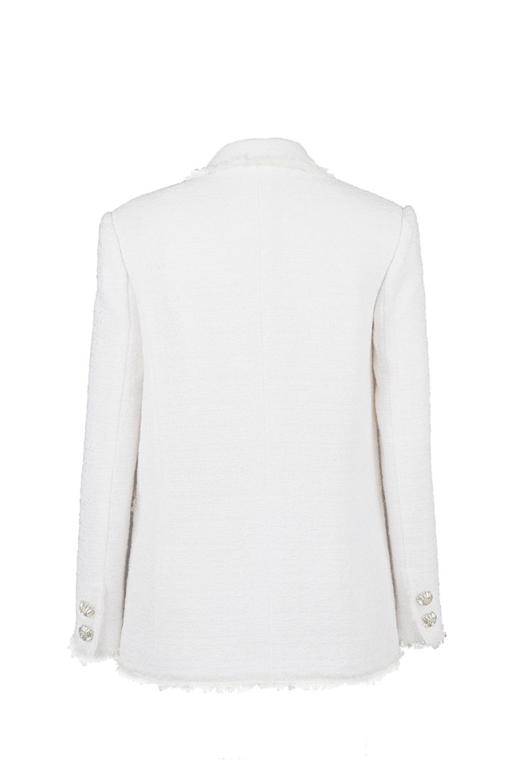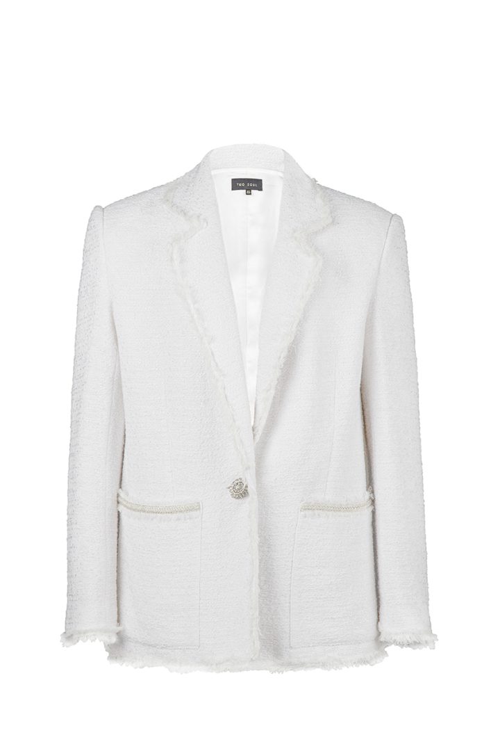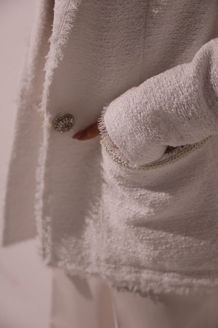 A women’s white tweed oversized jacket.It elegantly fastens with a single button and features two outer pockets tastefully adorned with a chain detail. The jacket boasts a luxurious silk lining, ensuring both style and comfort.