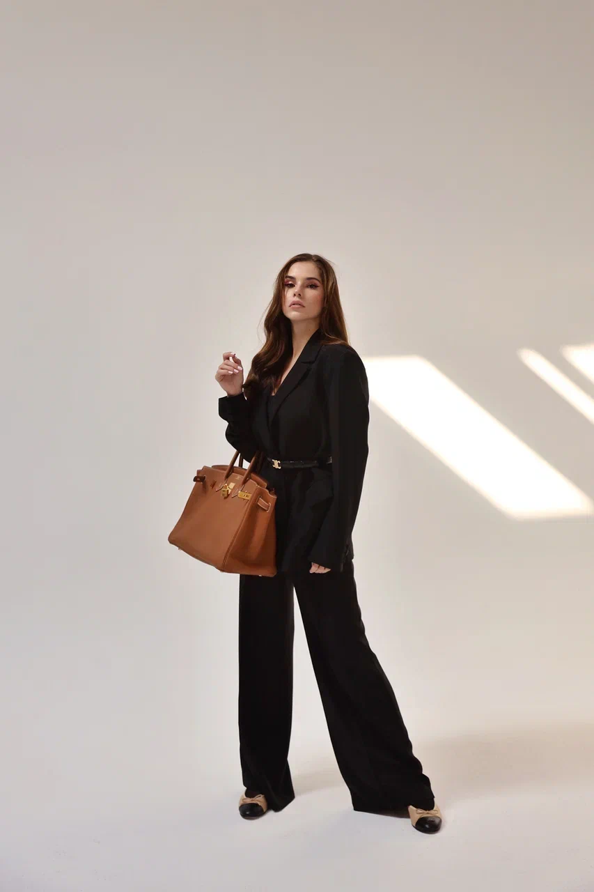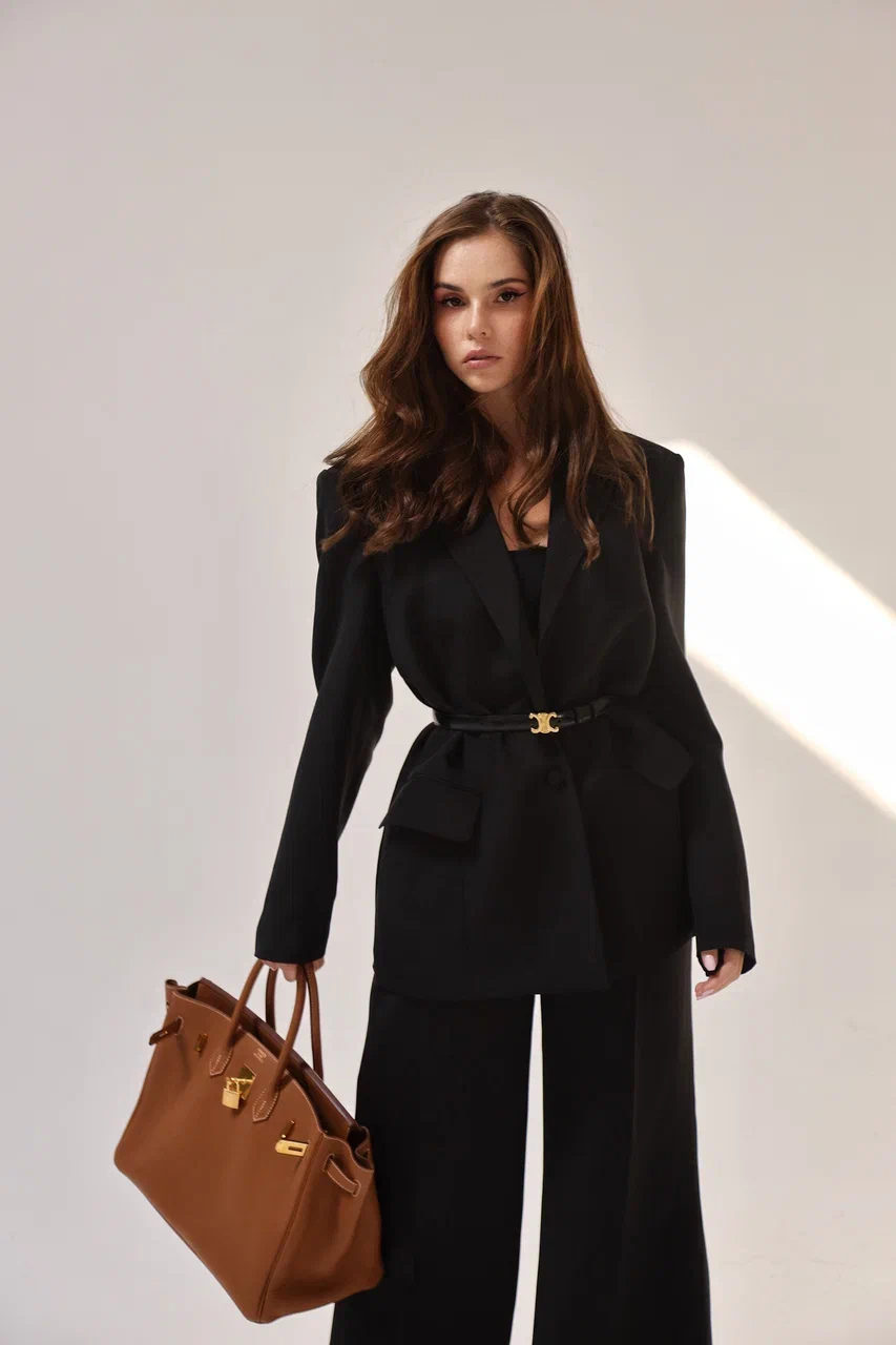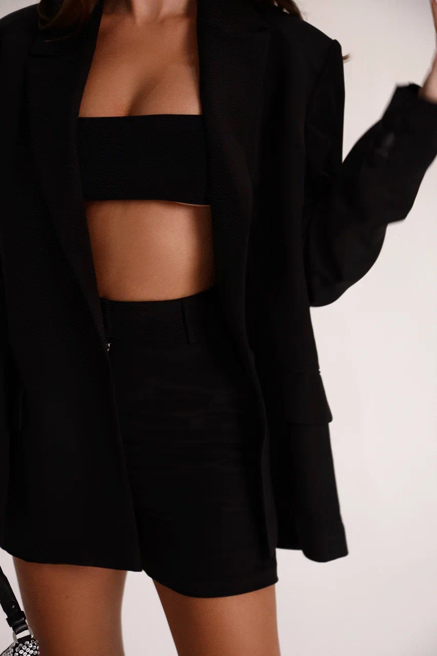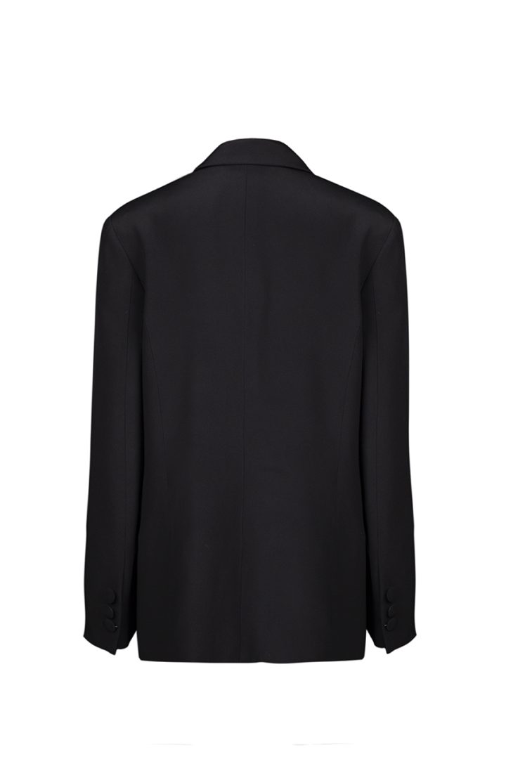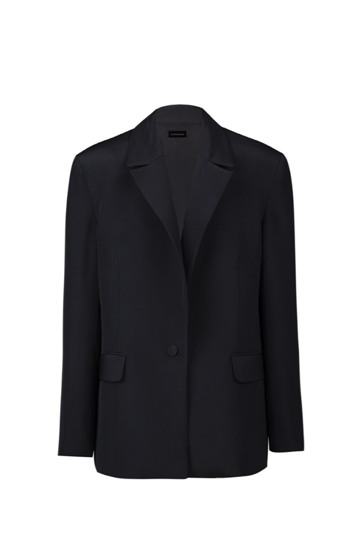 A women’s oversized black jacket from luxurious “Super Cady” silk fabric. This statement piece features a silk lining for added comfort and elegance, fastening with a single button, and incorporating two convenient pockets. The sleeves are tastefully adorned with three buttons, elevating its sophistication.