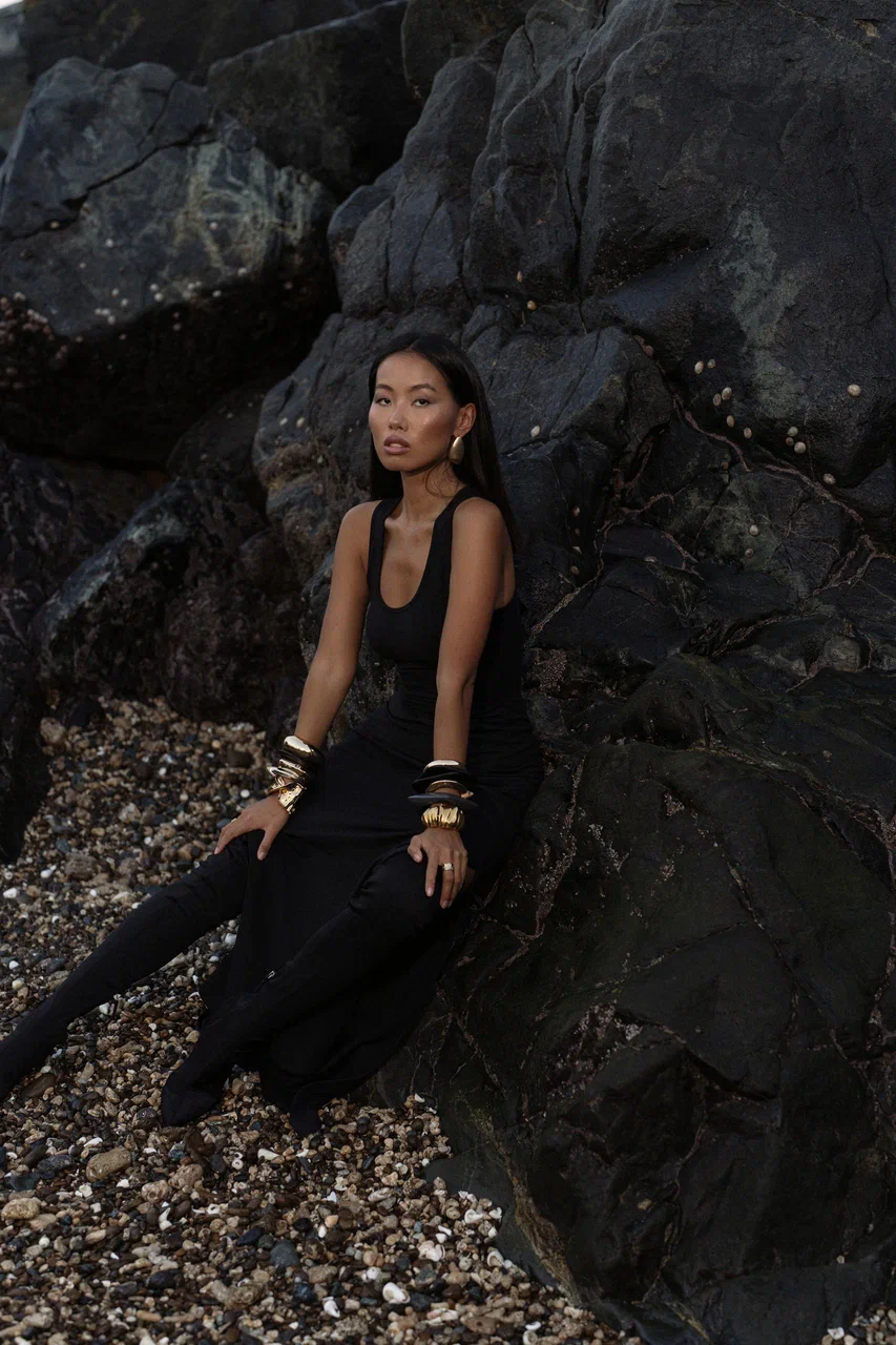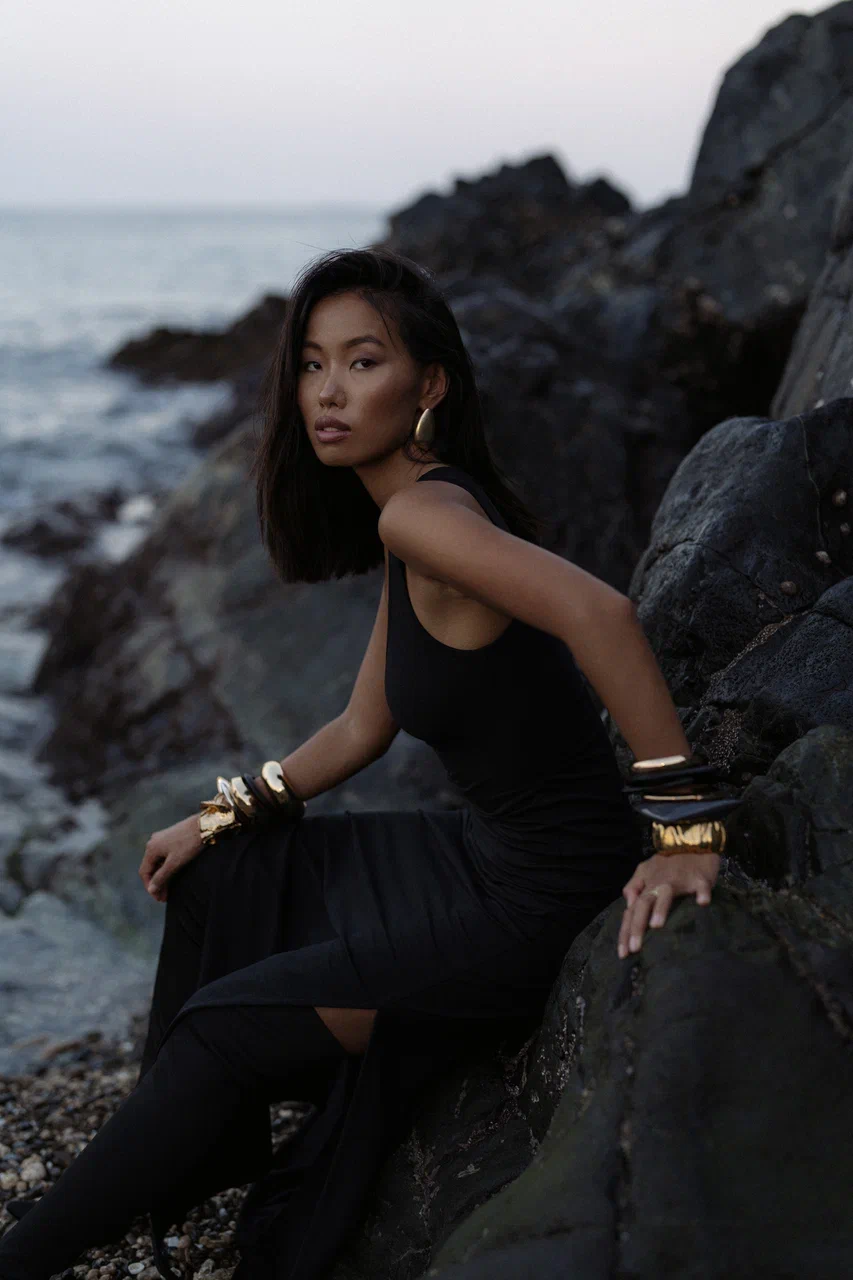 This is full-length dress with side slits, featuring a form-fitting silhouette. The top part of the dress is designed in a t-shirt style, giving it a loose and effortless look. Crafted from Finest italian Jersey fabric, this dress seamlessly blends style and comfort, perfectly accentuating your individuality in any situation.