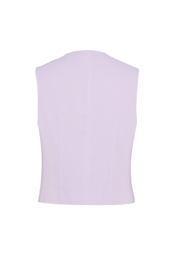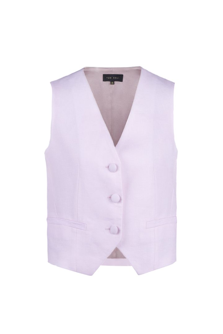 A women’s Linen vest in a light pink hue in a classic style, it has a silk lining. it fastens with three buttons, and slash pockets on the sides give it functionality.
