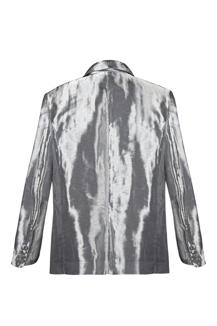 A Women Jacket Made from a unique metallic-colored fabric. crafted in a classic style, with a straight silhouette, it features a silk lining, fastened with one button, it has one welt pocket at the top left side of the jacket , as well as two patch pockets on the sides.