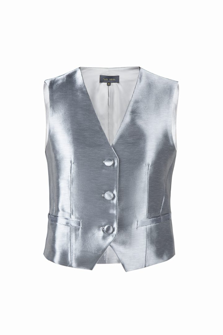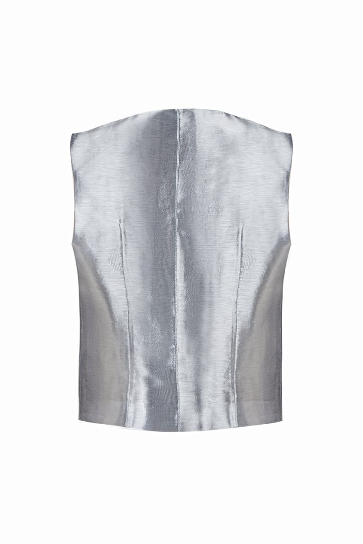 A women’s vest made from a unique metallic-colored fabric. crafted in a classic style, it features a silk lining. Fastened with three buttons, and its side slit pockets add functionality.