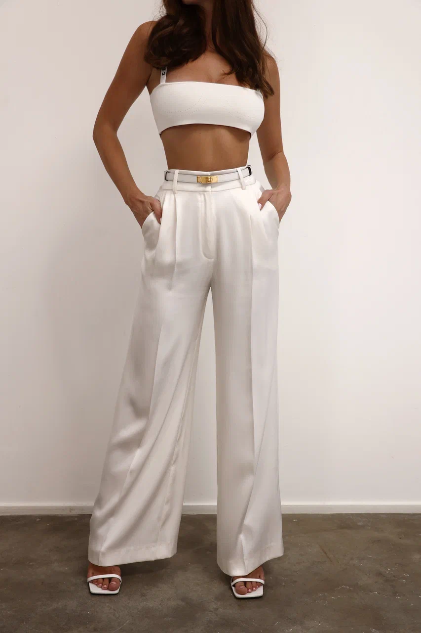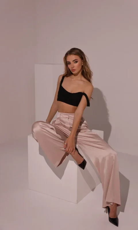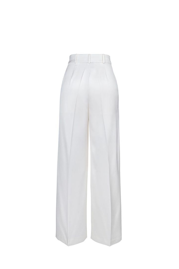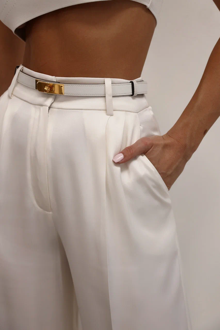 Women’s white pants made from exquisite silk fabric – an elegant combination of a classic high-rise design with a slight flare towards the bottom. These trousers feature two practical pockets and fasten with a zipper and button, blending elegance with functionality.