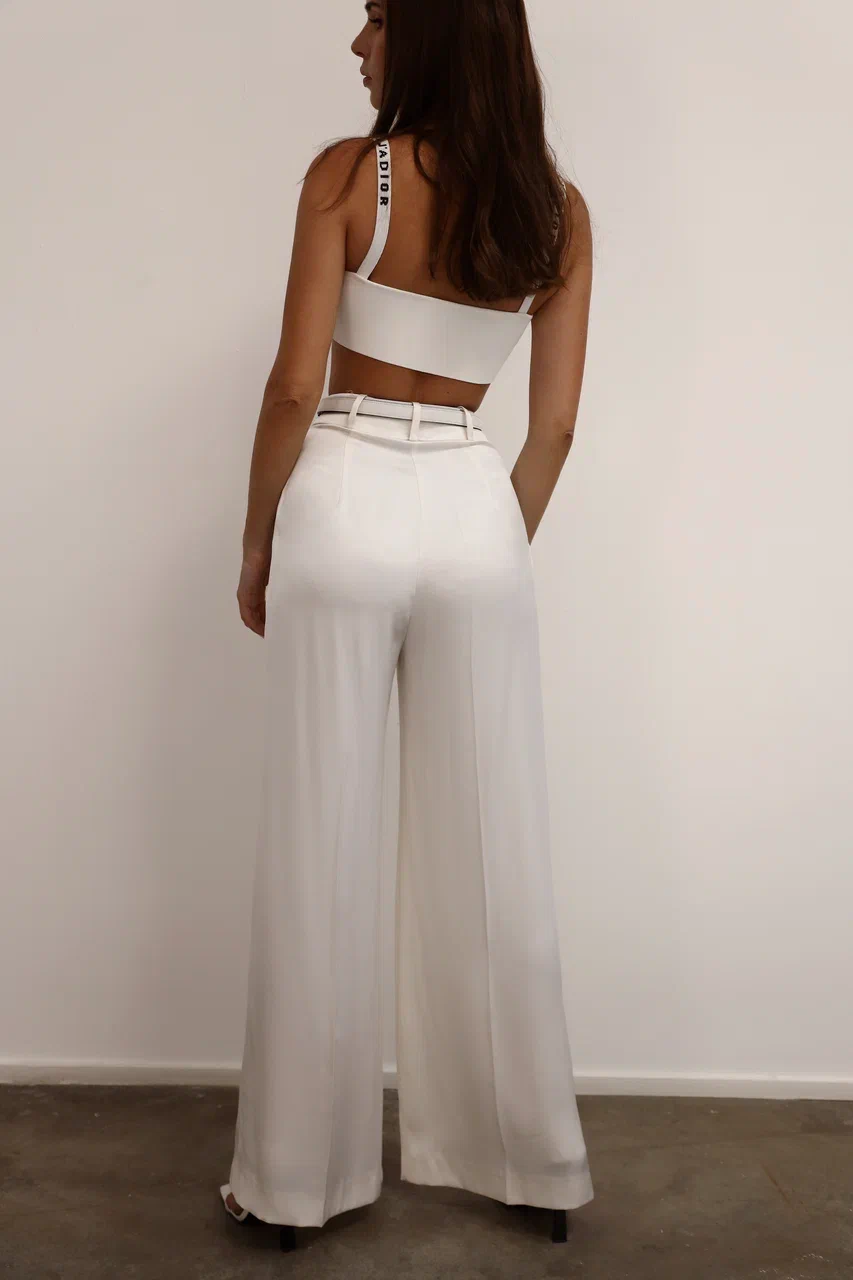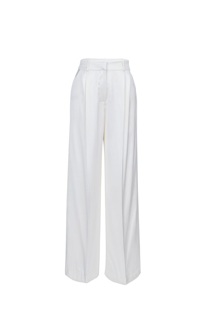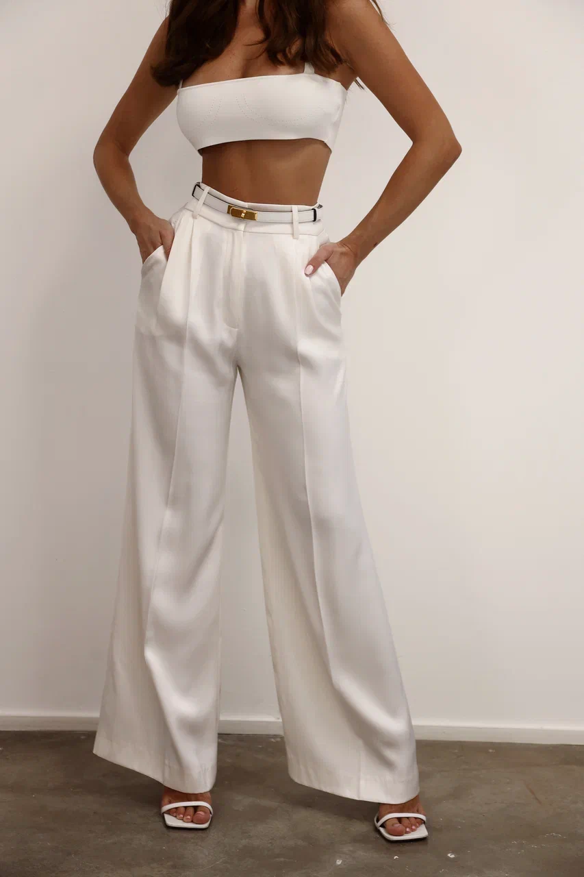 Women’s white pants made from exquisite silk fabric – an elegant combination of a classic high-rise design with a slight flare towards the bottom. These trousers feature two practical pockets and fasten with a zipper and button, blending elegance with functionality.