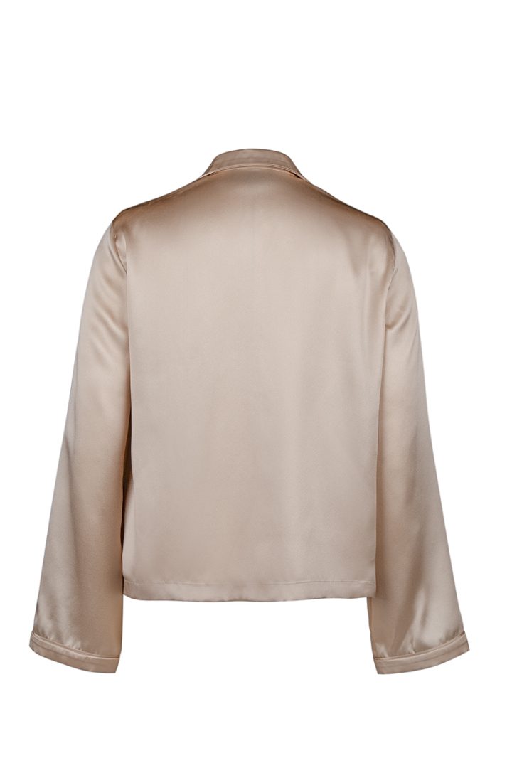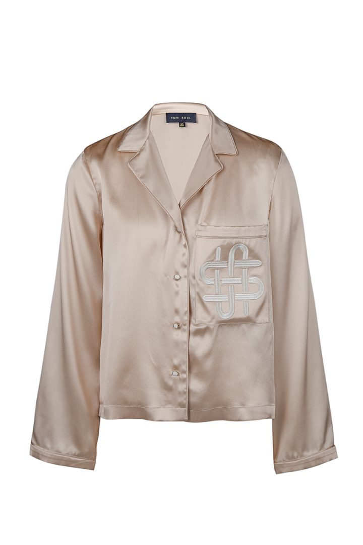 This is an exquisite women’s silk top, presented in a classicstyle with a standard length. it is adorned with a single pocket embollished with the unique Two Soul embroidery, adding a special charm to it. The top fastens with four buttons, emphasizing it style and elegance.