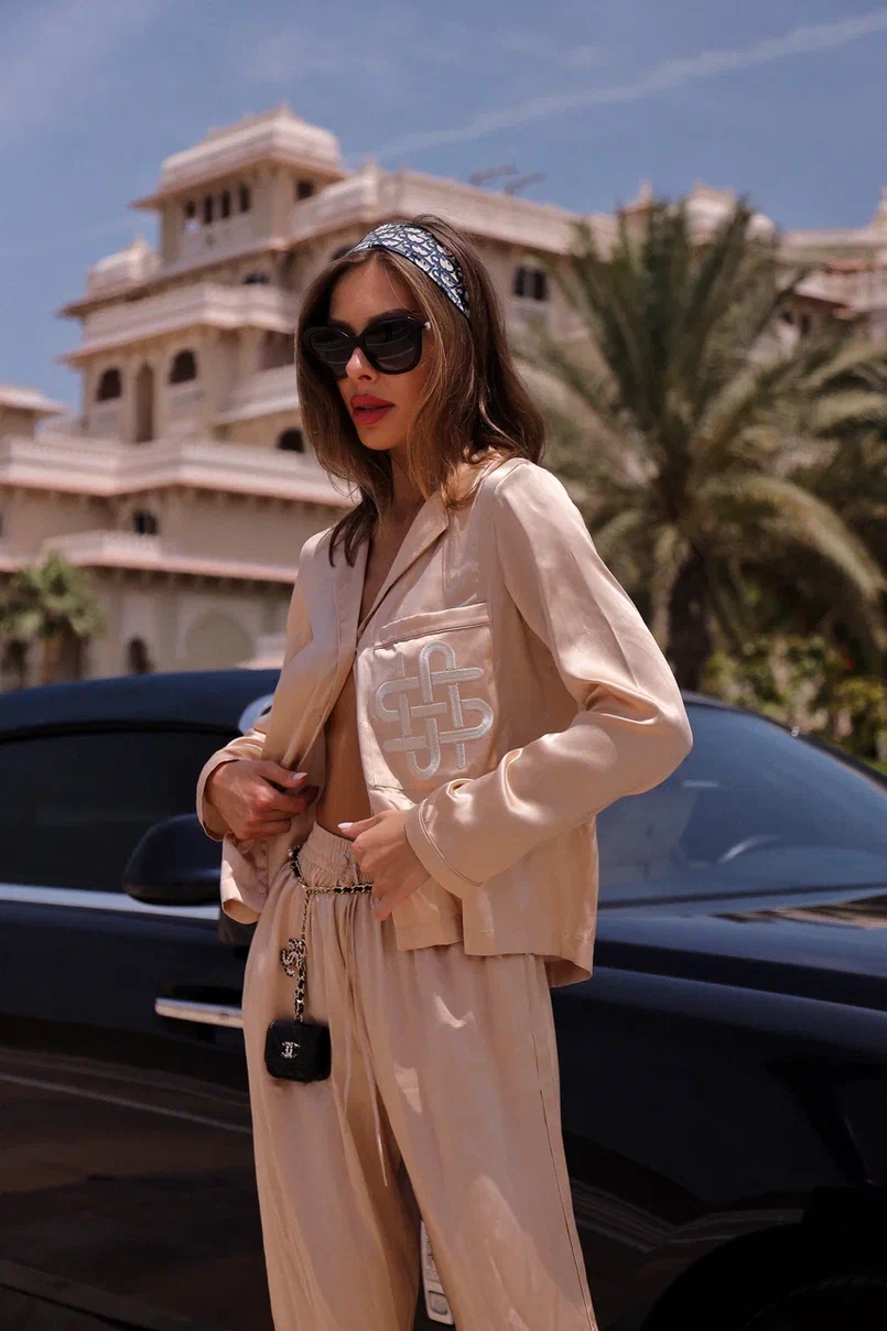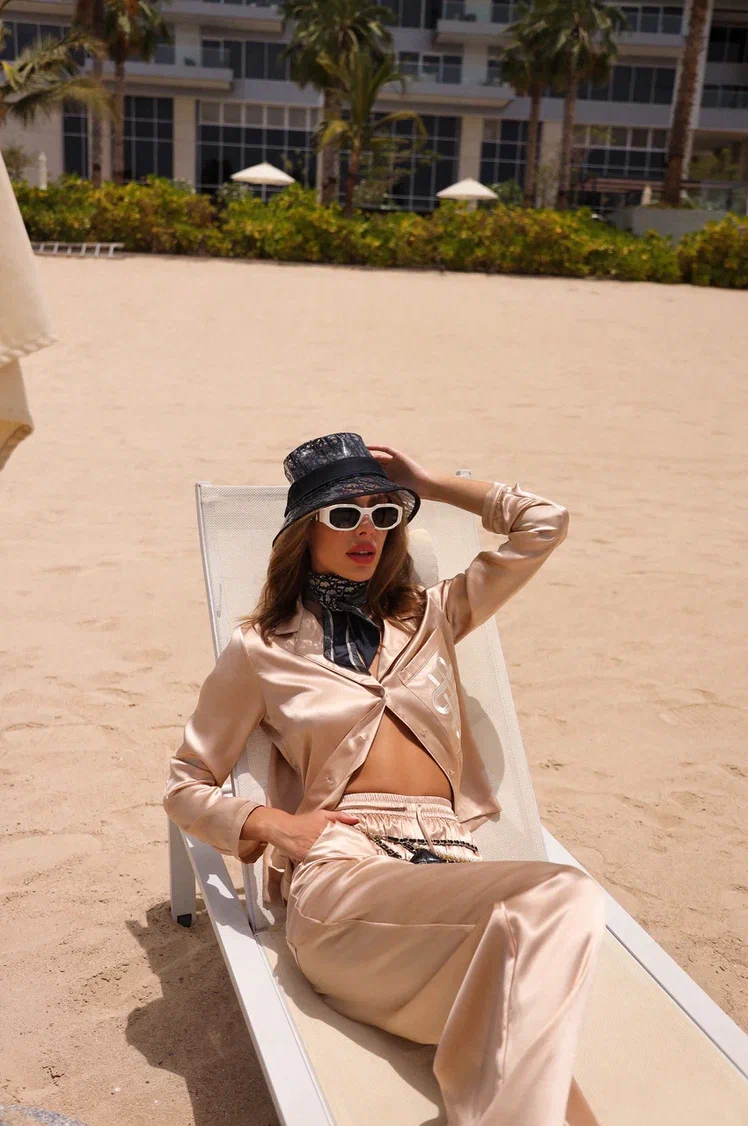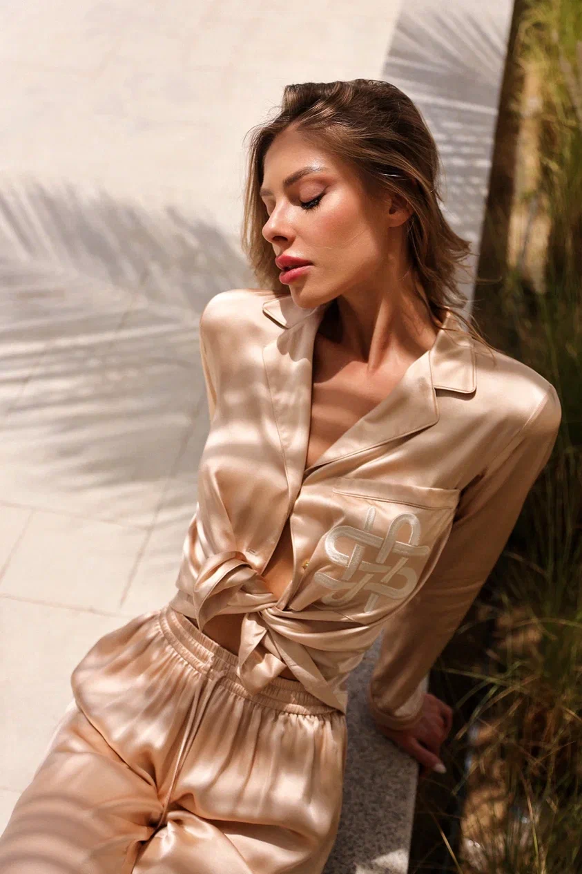 Beige silk Top are a symbol of comfort and style. With a comfortable elastic waistband and an elegant flare towards the bottom, they provide exceptional comfort.