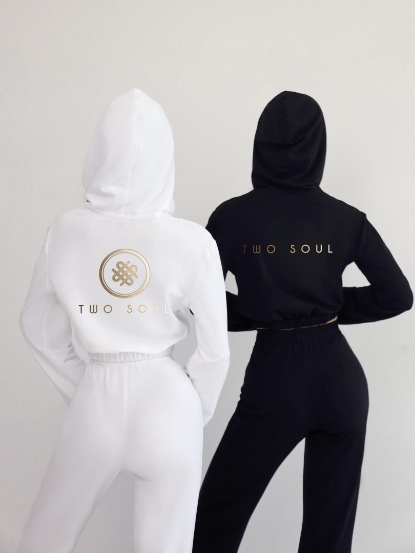 The white sporty suit is a stylish set consisting of a sweatshirt and pants. The sweatshirt has a short length up to the waist, long sleeves with cuffs, and a hood. The brand logo is embroidered on the chest, and there’s an “Two Soul” embroidery on the back. The pants feature a high waist, a figure-hugging fit, and a slight flare towards the bottom, completing this contemporary look.