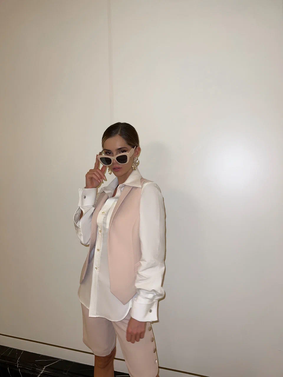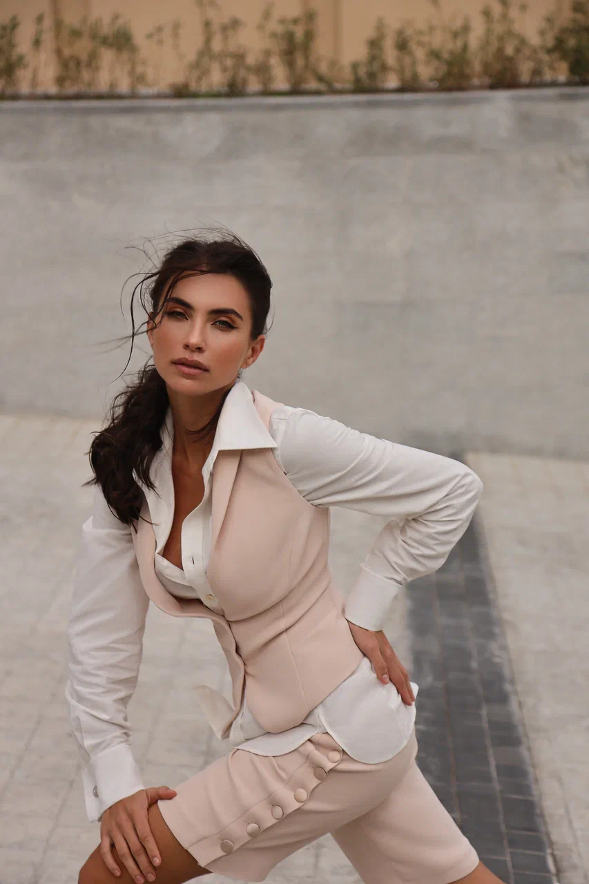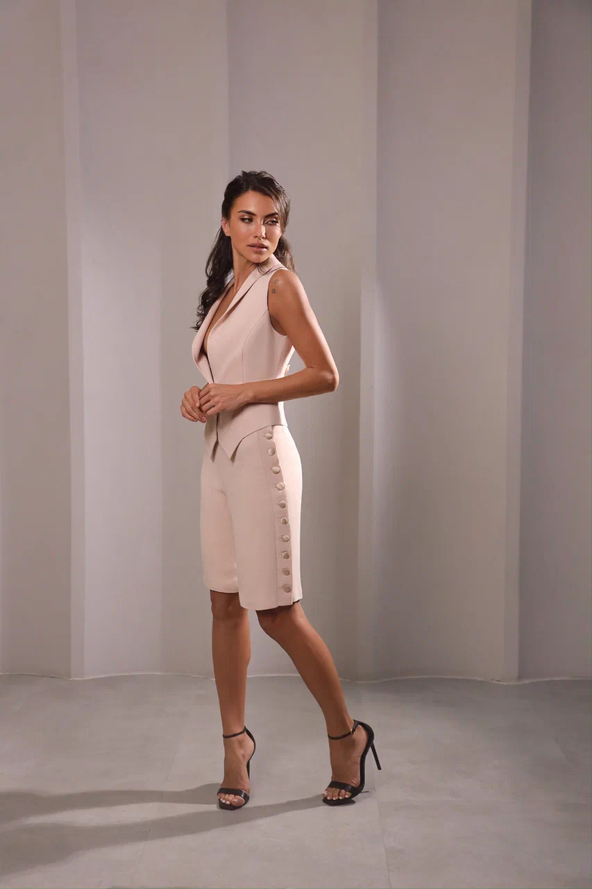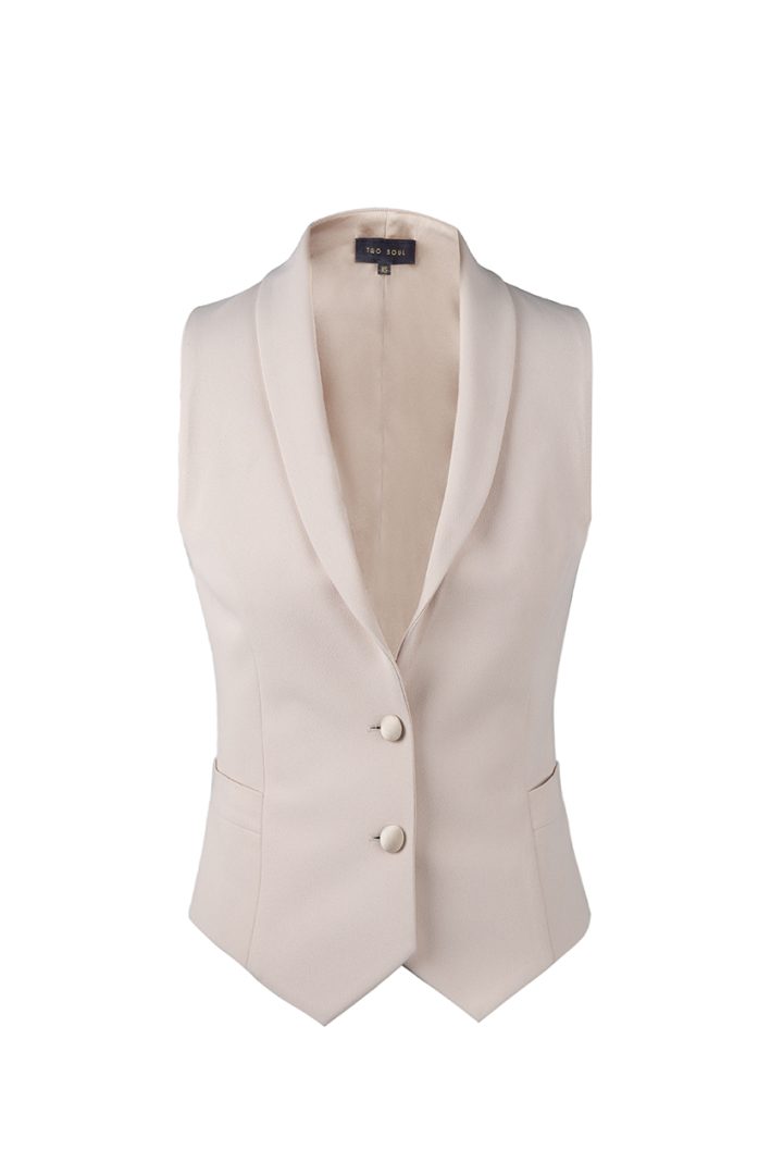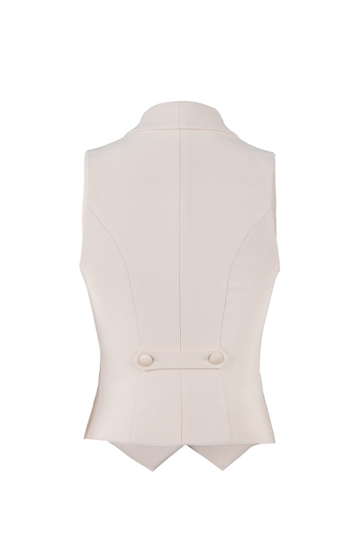 Beige Vest in Cady Fabric, Classic Style with collar. The vest is fastened with Two buttons. it has a 100% silk lining and two slash pockets on the side.