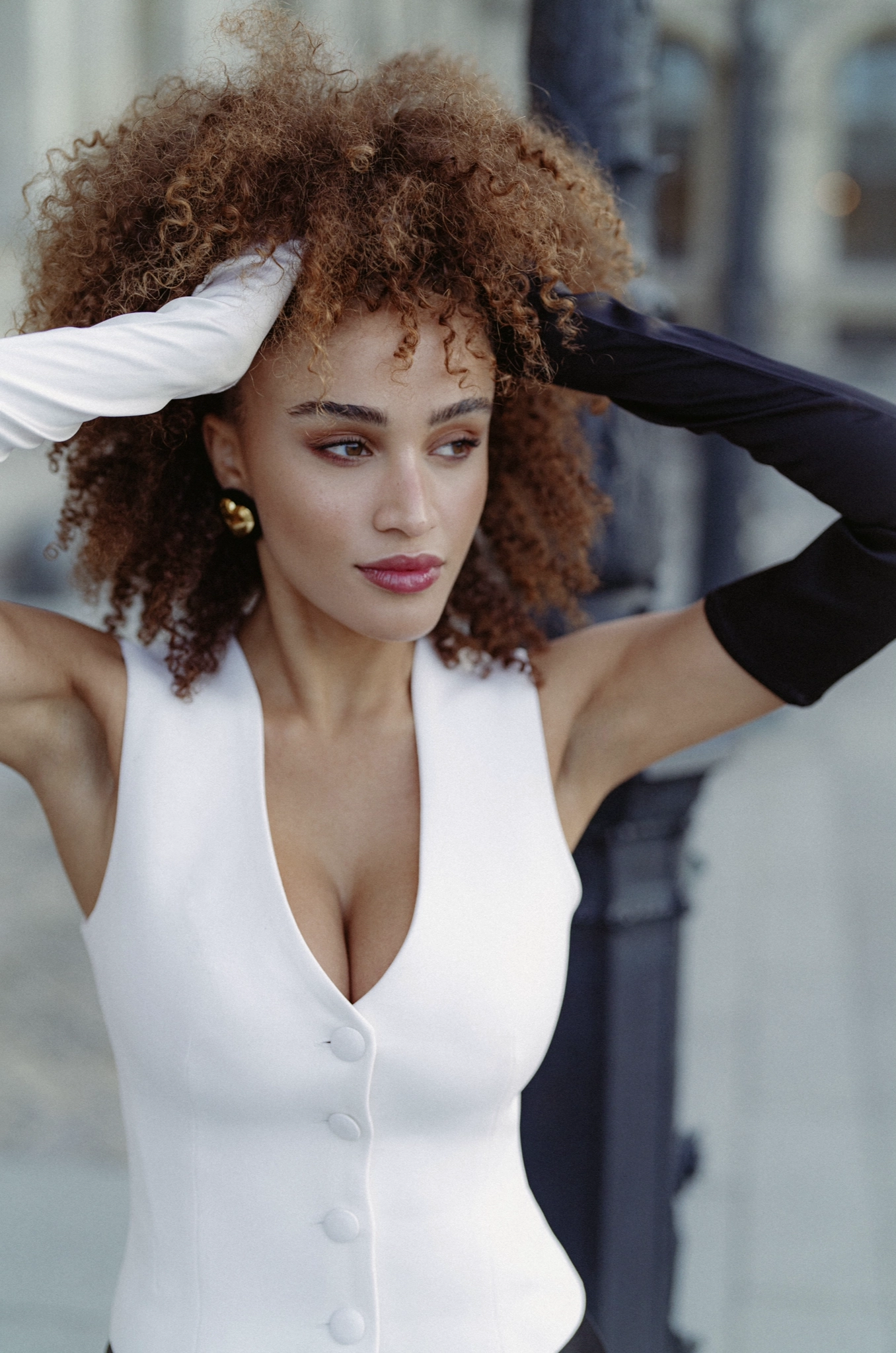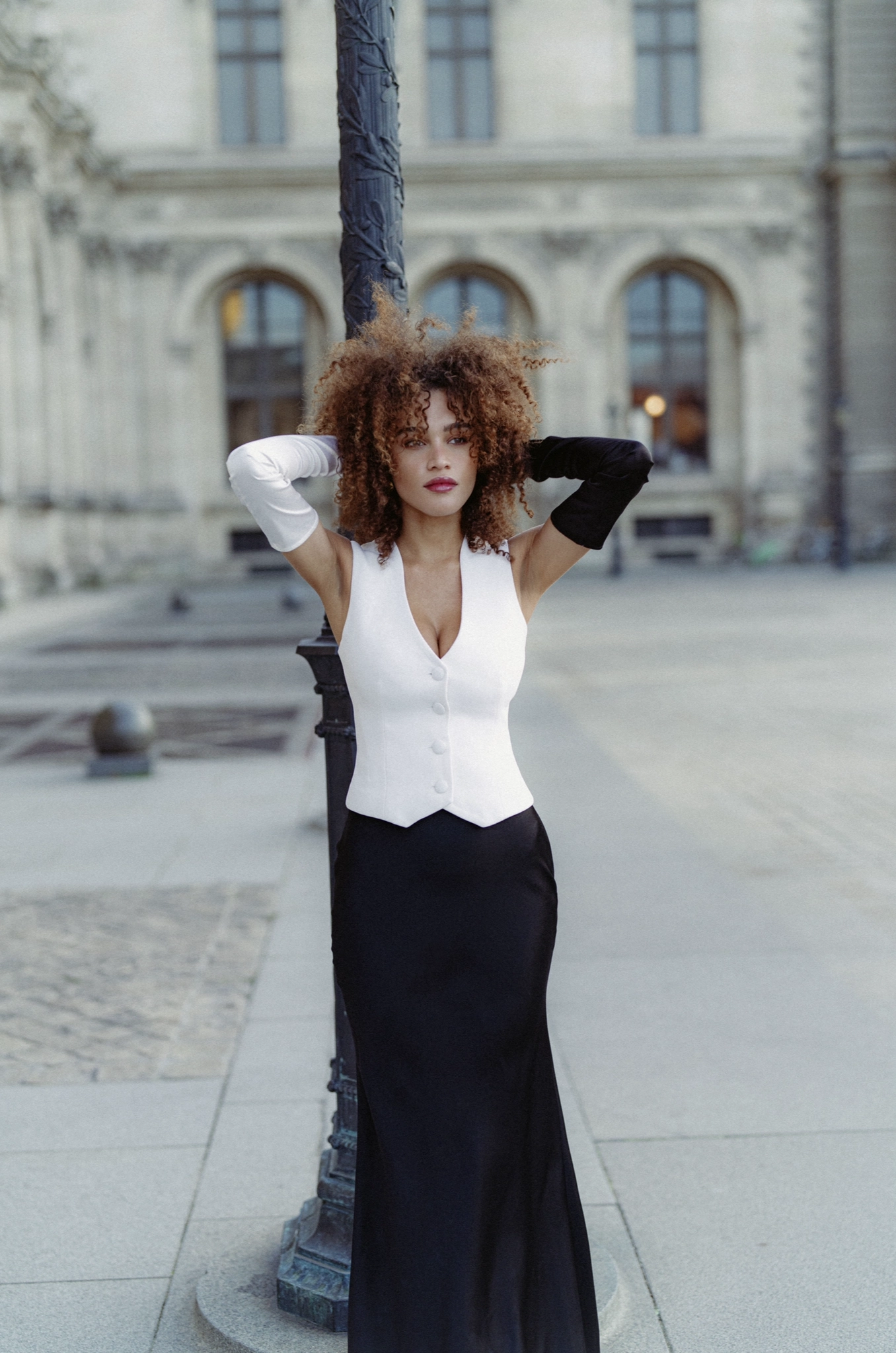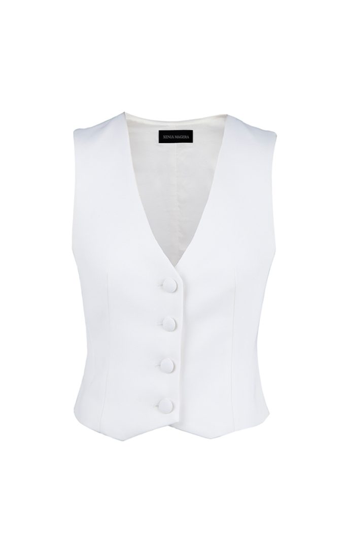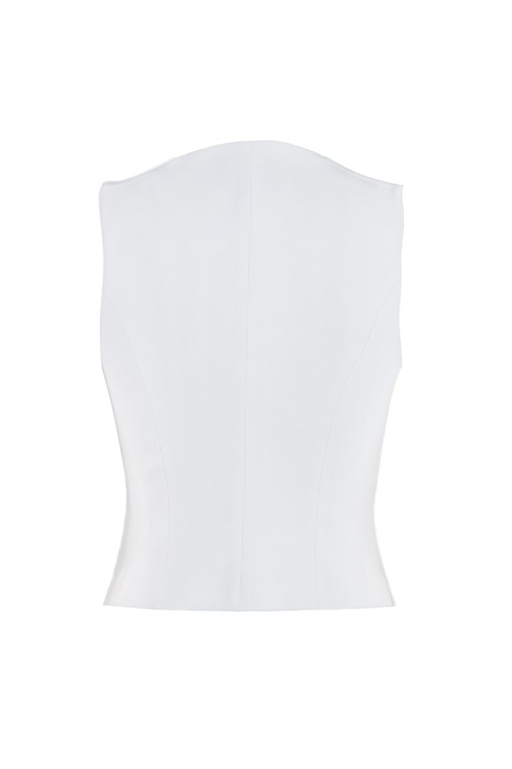 Fabric description: Made of 55% Acetate, 45% Viscose Lining: 100% silk Beige cady fabric vest, in a classic style, tailored to hug the figure and…