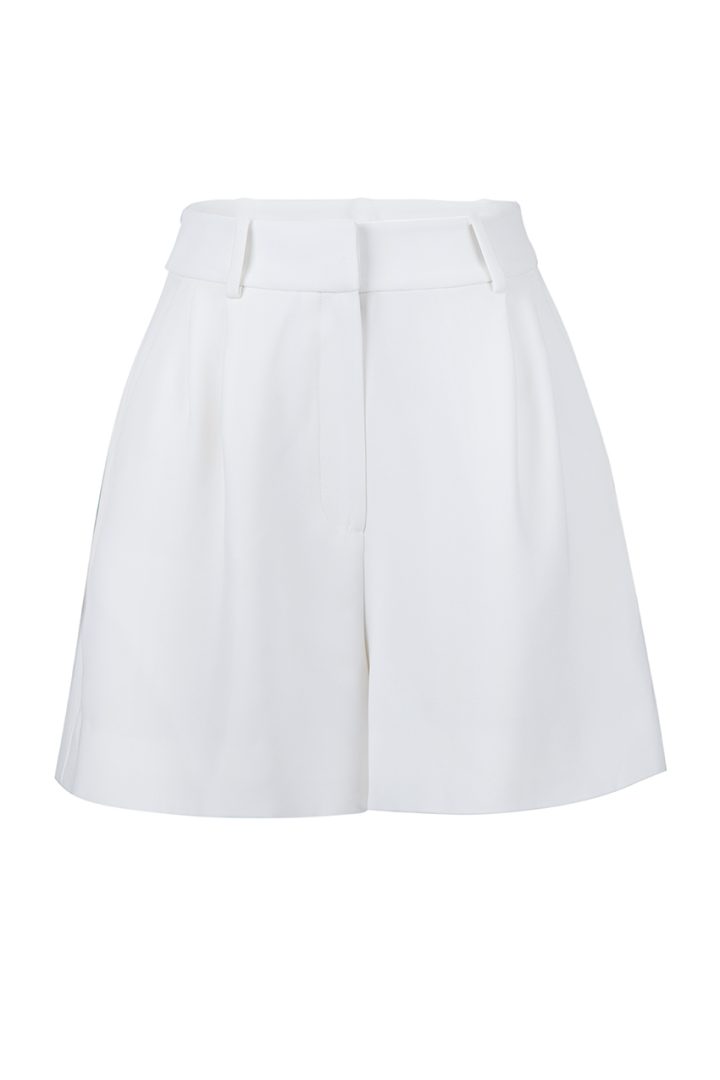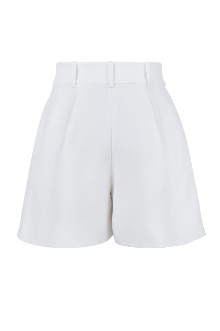 Women’s White Silk Cady shorts featuring classic high waist with a slight flare towards the bottom. They are lined with silk. These shorts fastens with a button and a front zipper, also includes the belt loops on the waist band for wearing it with a belt.